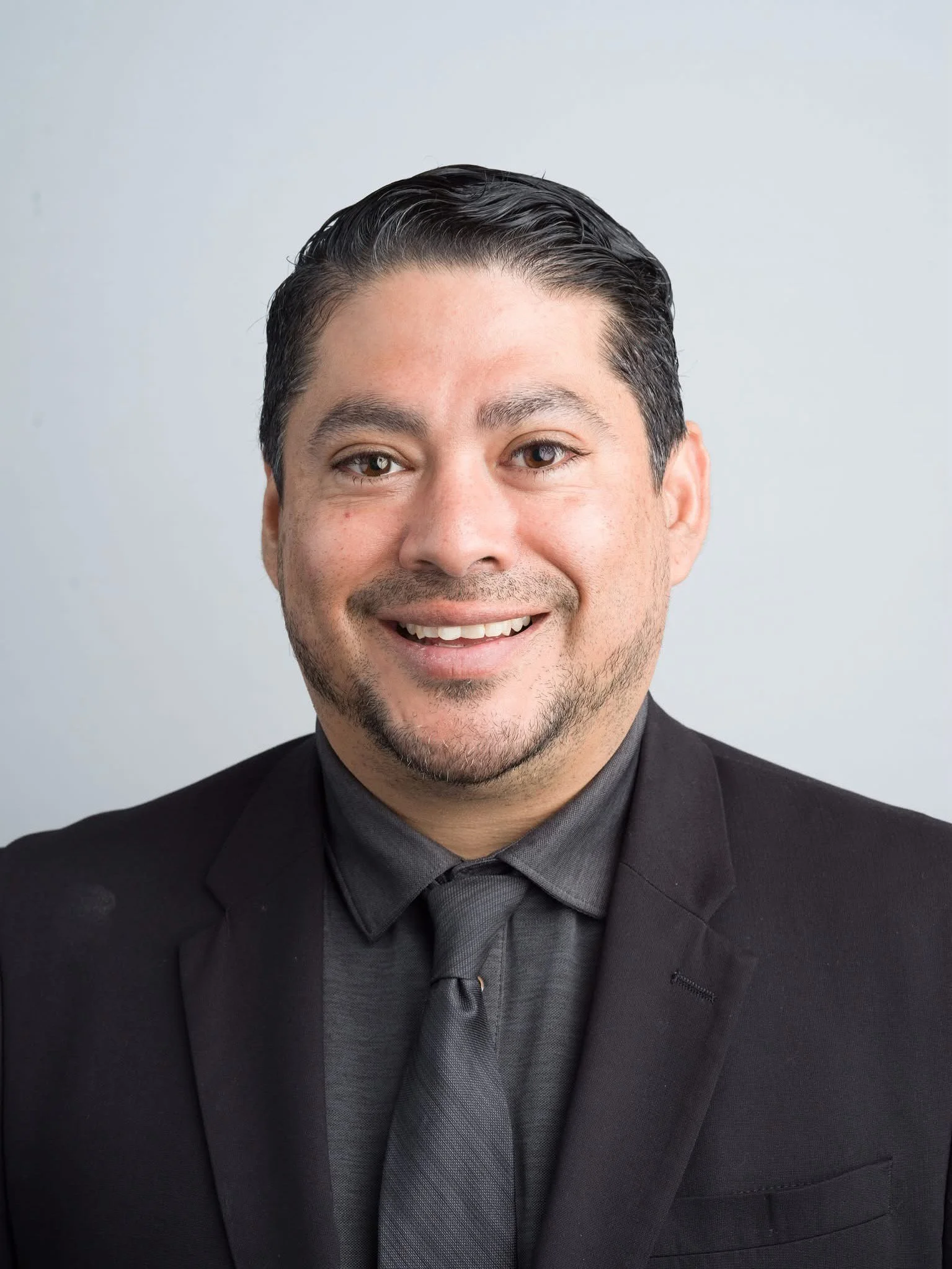 Professional headshot of a smiling man with dark hair, wearing a black suit, gray shirt, and gray tie, against a plain light background.